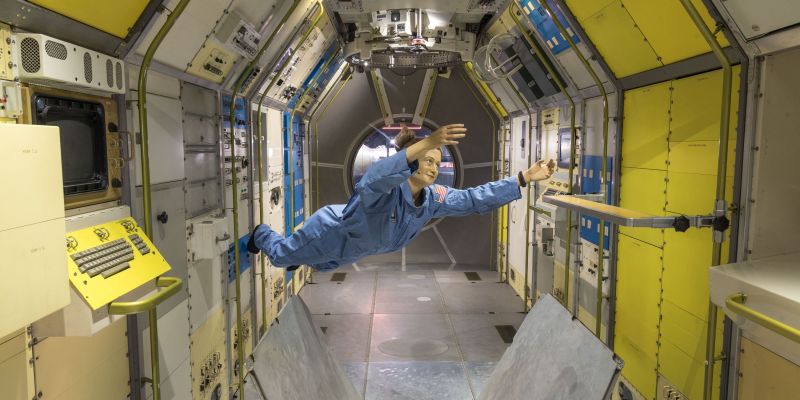 Blick ins schwebende Spacelab mit schwereloser Astronautin. Reinhard Krause